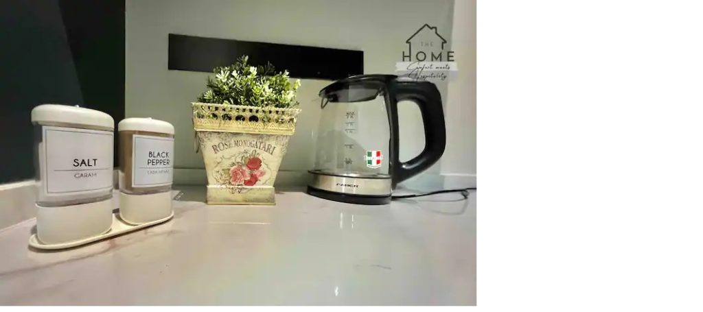 Fully equipped kitchen with Gas Stove, cooking pans, kettle, Microwave and oven. Washing machine and dryer available.